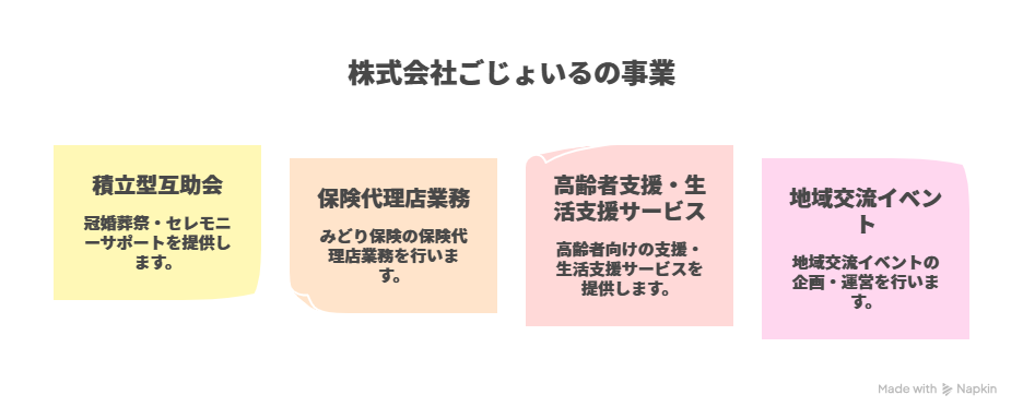 地域の皆さまに支えられながら歩んできた私たち「ごじょいる」は、冠婚葬祭の互助会事業をはじめ、保険・生活サポート・地域イベントなど、暮らしを支える多角的なサービスを展開しています。