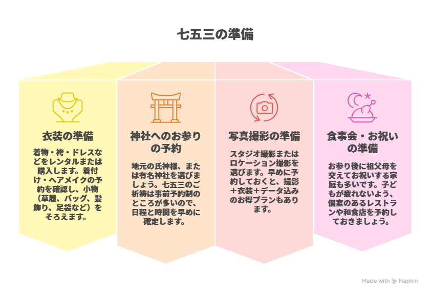 七五三は「衣装」「お参り」「撮影」「食事会」の4ステップで考えるとスムーズです。