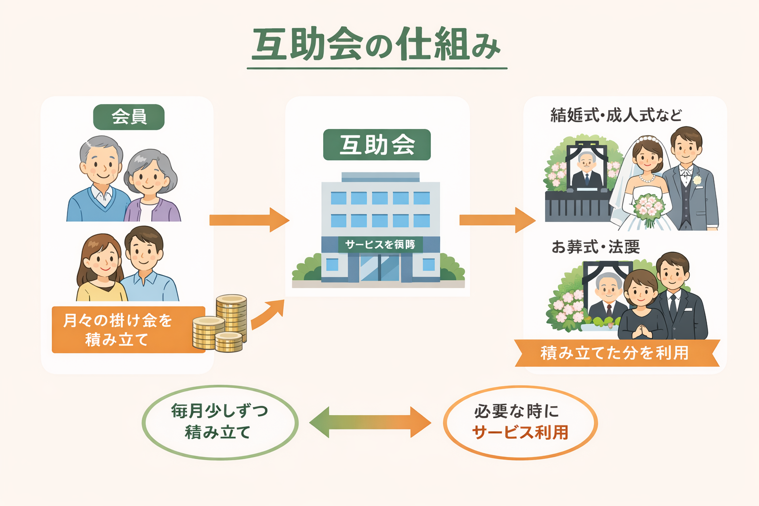 互助会は、将来の冠婚葬祭に備えて、毎月少しずつ積み立てる仕組みです。